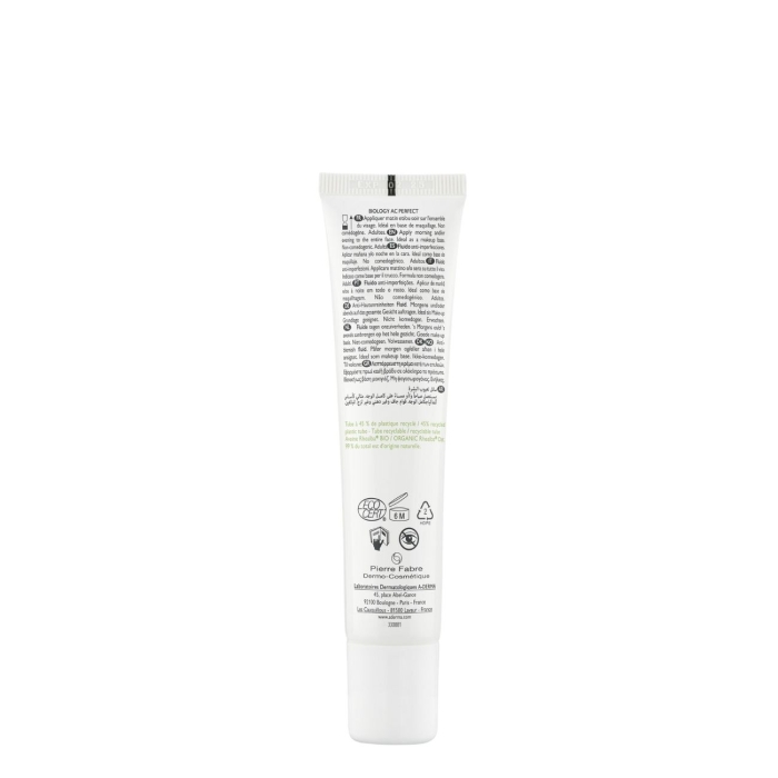 Aplique A-Derma Biology AC Perfect Fluido Anti-Imperfeições diariamente na pele do rosto limpa e seca.