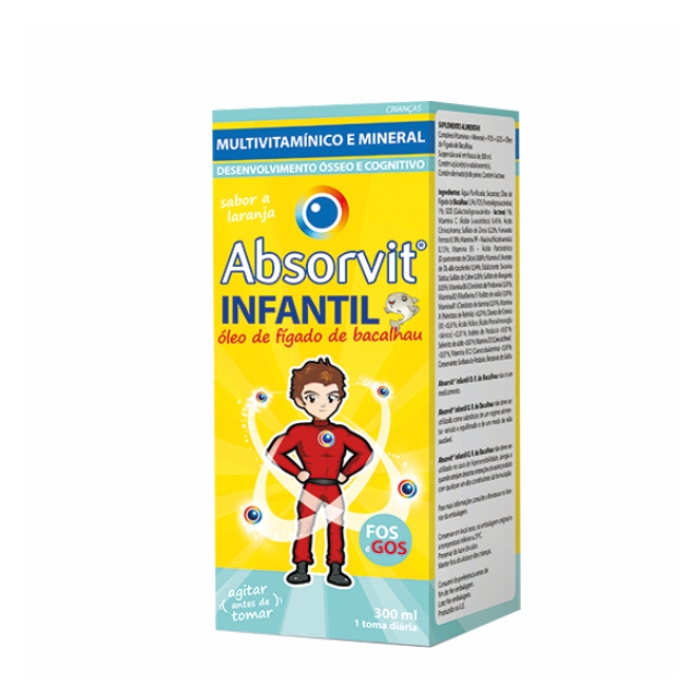 Absorvit Infantil Óleo de Fígado de Bacalhau é um suplemento alimentar infantil que contribui para o crescimento ósseo e cognitivo normal nas crianças a partir dos 3 anos.