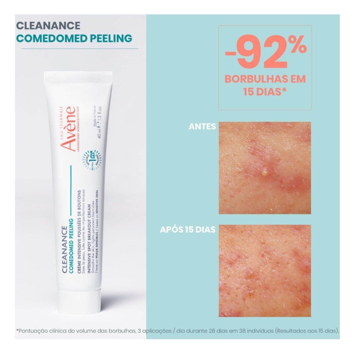 Aplique Avène Cleanance Comedomed Peeling Tratamento Localizado Anti-Imperfeições nas imperfeições da pele, duas vezes por dia.