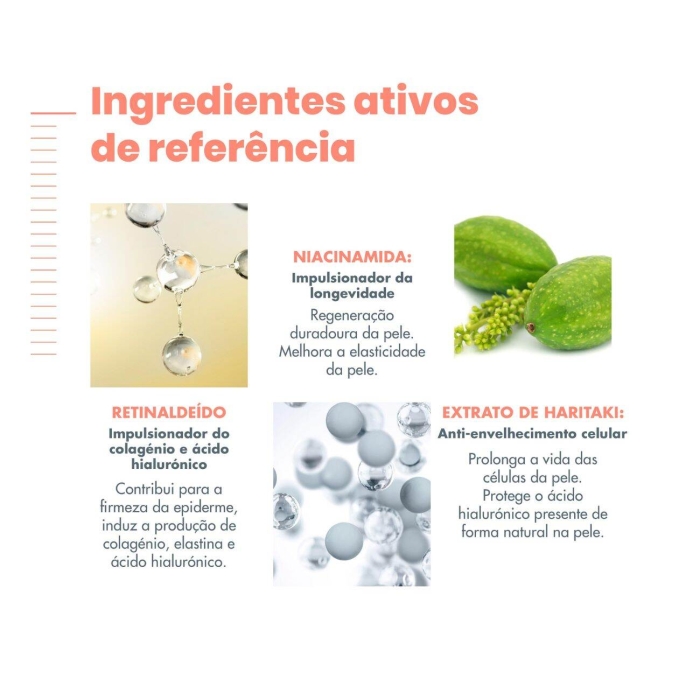 - Com 0.1% de Retinaldeído (10x mais ativo do que o retinol) para reduzir as rugas e renovar a pele