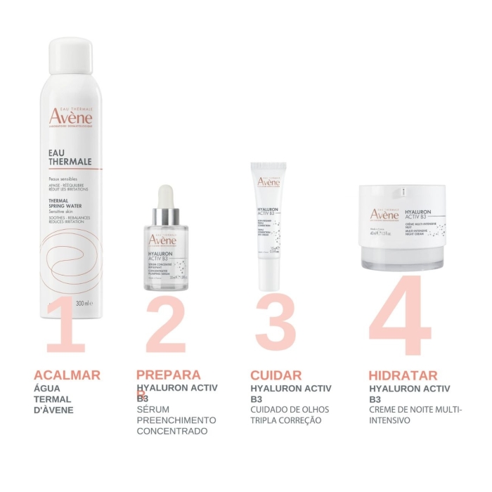 Aplique Avène Hyaluron Activ B3 Creme Noite Multi-intensivo de noite, na zona do rosto, pescoço e decote, depois da limpeza e do sérum.
