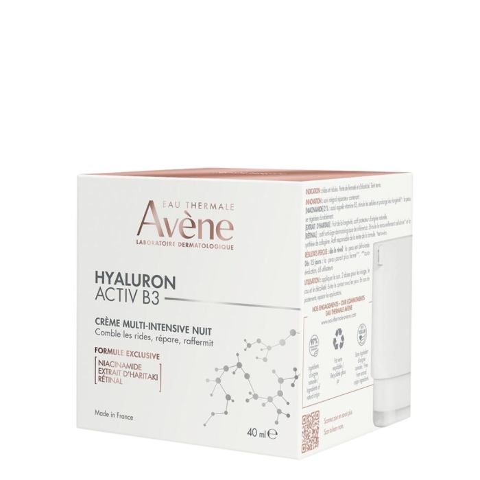 Com retinaldeído, Avène Hyaluron Activ B3 Creme Noite Multi-intensivo é um creme de noite que restaura a atividade celular para corrigir todos os sinais de idade.