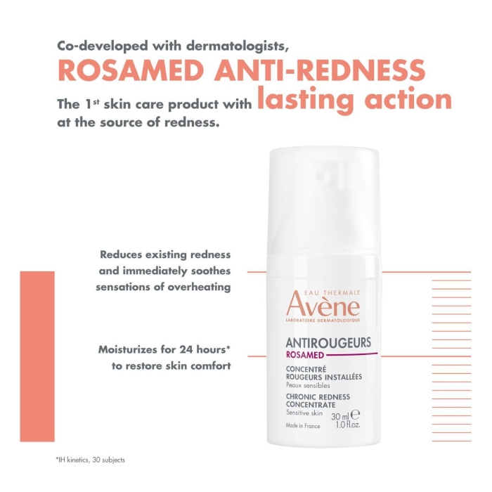Avène Antirougeurs Rosamed Concentrado Anti-Vermelhidão acalma imediatamente a pele sensível e frágil, reestabelecendo o seu conforto e hidratação.