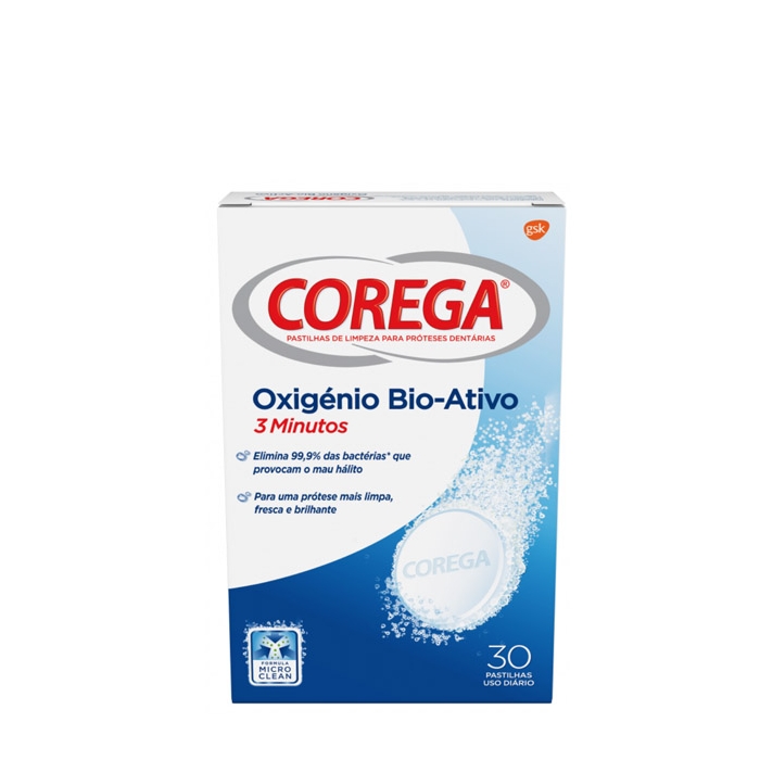 Corega Oxigênio Bio-Activo Pastilhas ajudam a limpar profundamente a prótese e a restaurar a sua cor original.