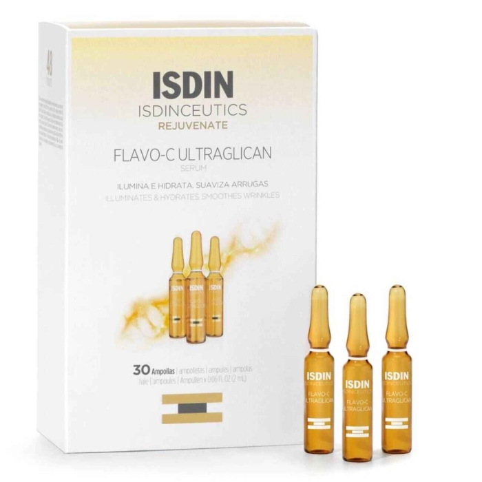 Isdin Isdinceutics Flavo-C Ampolas Ultraglican é uma solução facial em ampolas reafirmante e anti-idade para todo o tipo de pele.