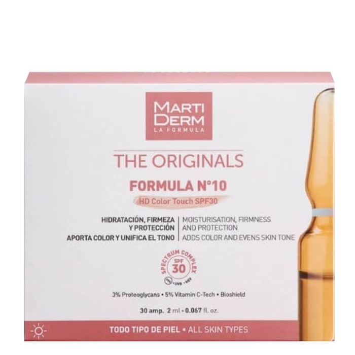 Martiderm Formula nº10 HD Color Touch SPF30 Ampolas são ampolas com cor e proteção solar, que iluminam a pele enquanto reduzem os sinais de envelhecimento.