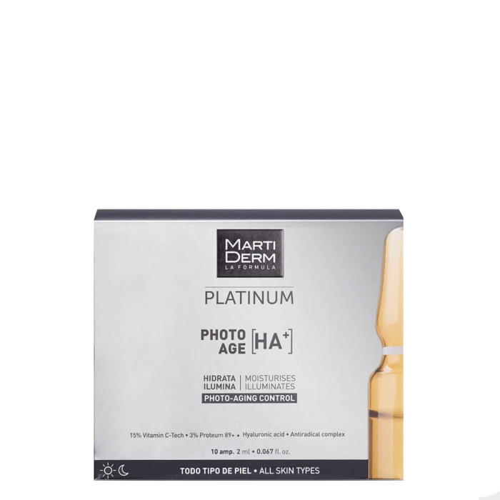 De ação antioxidante, Martiderm Platinum Photo-Age HA+ Ampolas hidratam e iluminam, enquanto alisam e melhoram a firmeza da pele.
