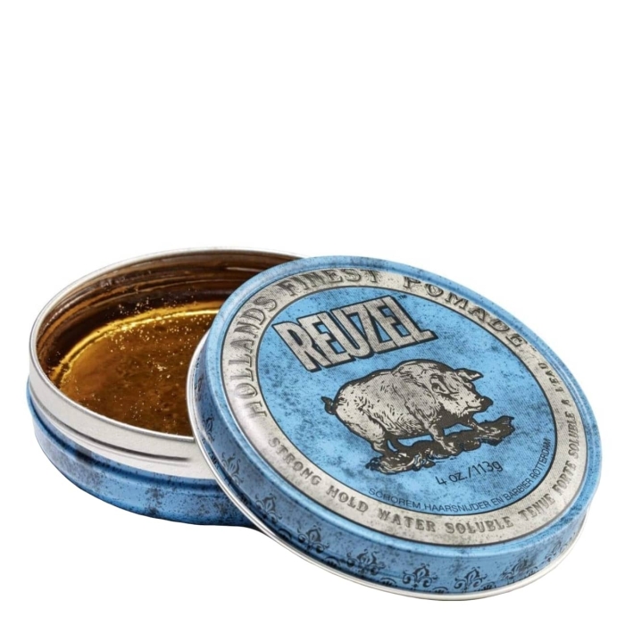 Reuzel Blue Pomade Pomada Solúvel é uma pomada de fixação forte para o cabelo.